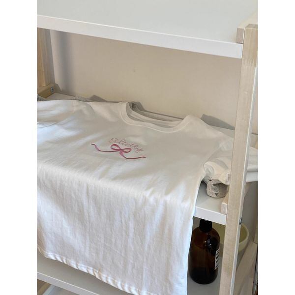 フェミニンで上品な印象を与えるレディースTシャツ、ラウンドネックにリボンと刺繍のディテールがアクセント。
