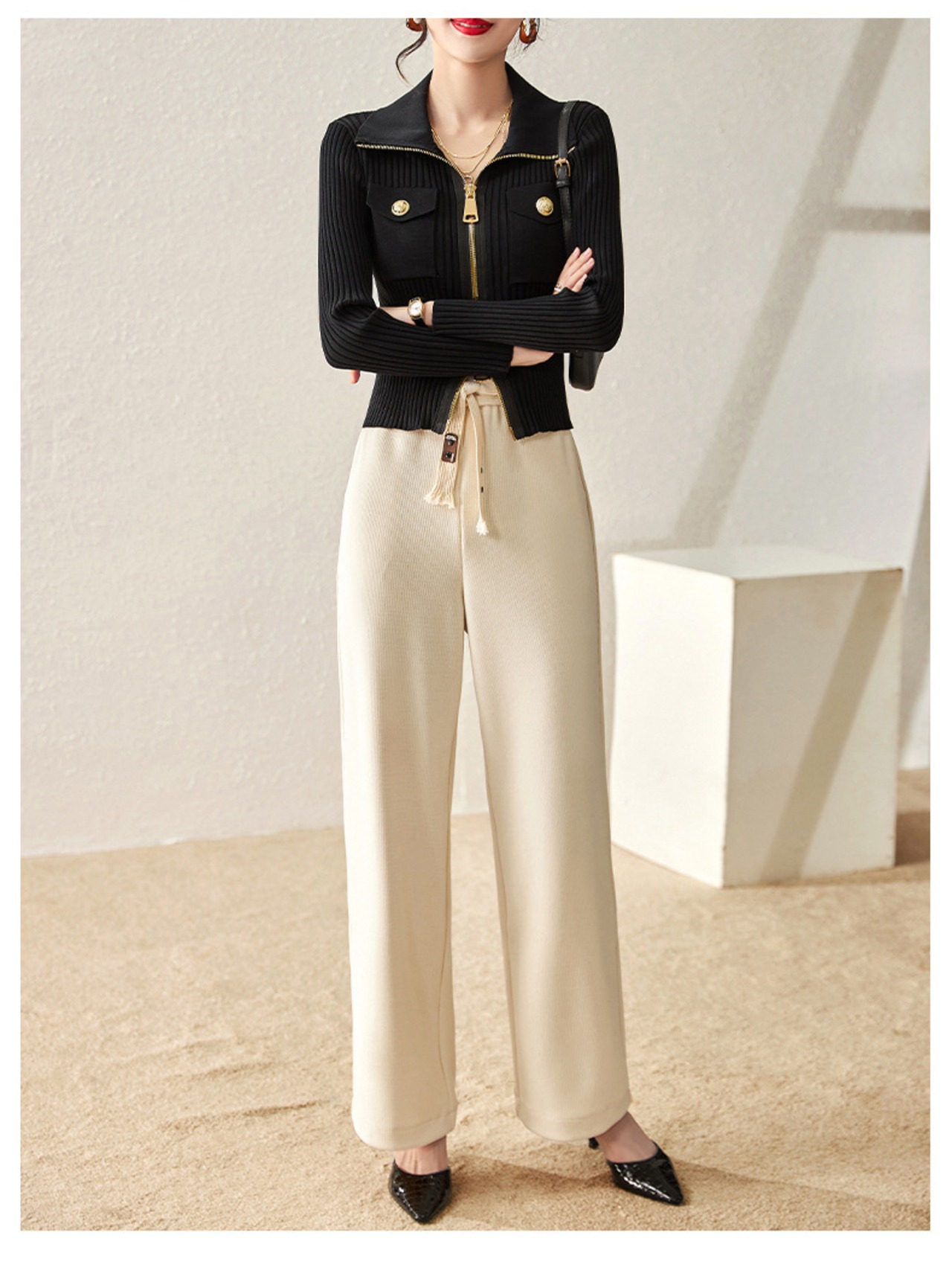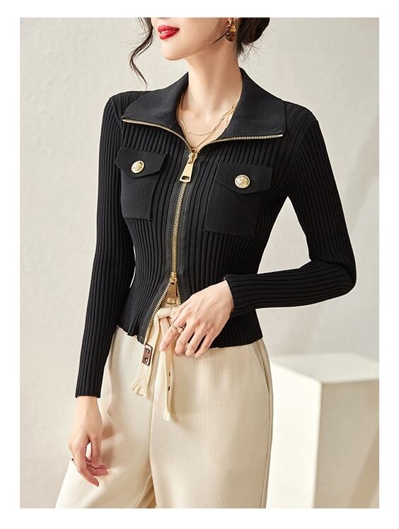 ダブルジップがカジュアルな印象の細身カーディガンが入荷しました!大きめの襟付きのショート丈で、大人可愛いスタイルが演出できる一枚です。