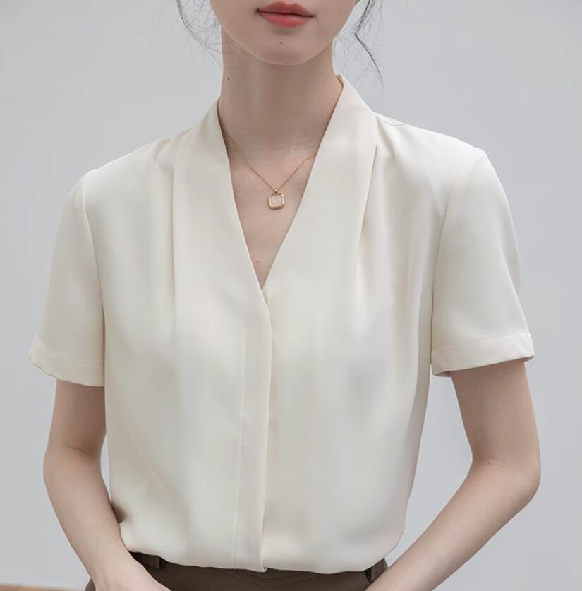 トップスの定番、Vネックのシャツブラウス。シンプルで上品なデザインが魅力で、様々な年代の女性に合わせてお選びいただけます。オフィスカジュアルからお出かけまで、幅広いスタイリングで活躍するアイテムです。