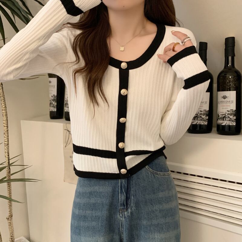 バイカラーがポイントのパイピング長袖ニットカーディガン。