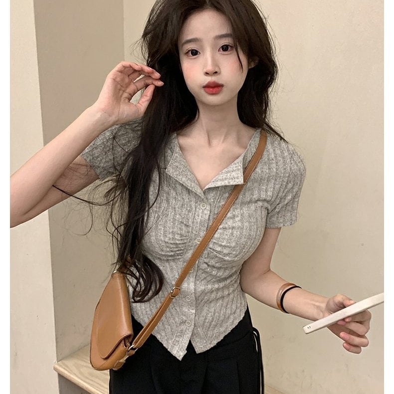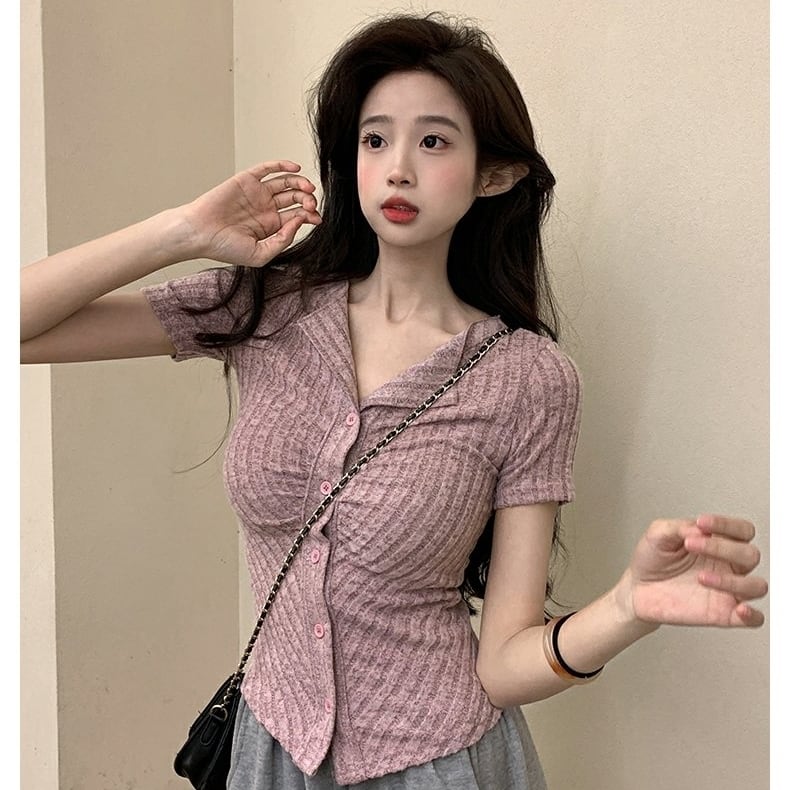 タイトなシルエットがセクシーなリブ入りのニットソーです。半袖のクルーネックデザインで、スリムなシルエットが女性らしさを引き立てます。前開きには可愛らしいボタンがアクセントとなり、ヴィンテージ感漂うデザインは大人可愛いスタイリングにぴったり!フェミニンな雰囲気を漂わせつつ、シンプルで上品な着こなしをお楽しみいただけます。