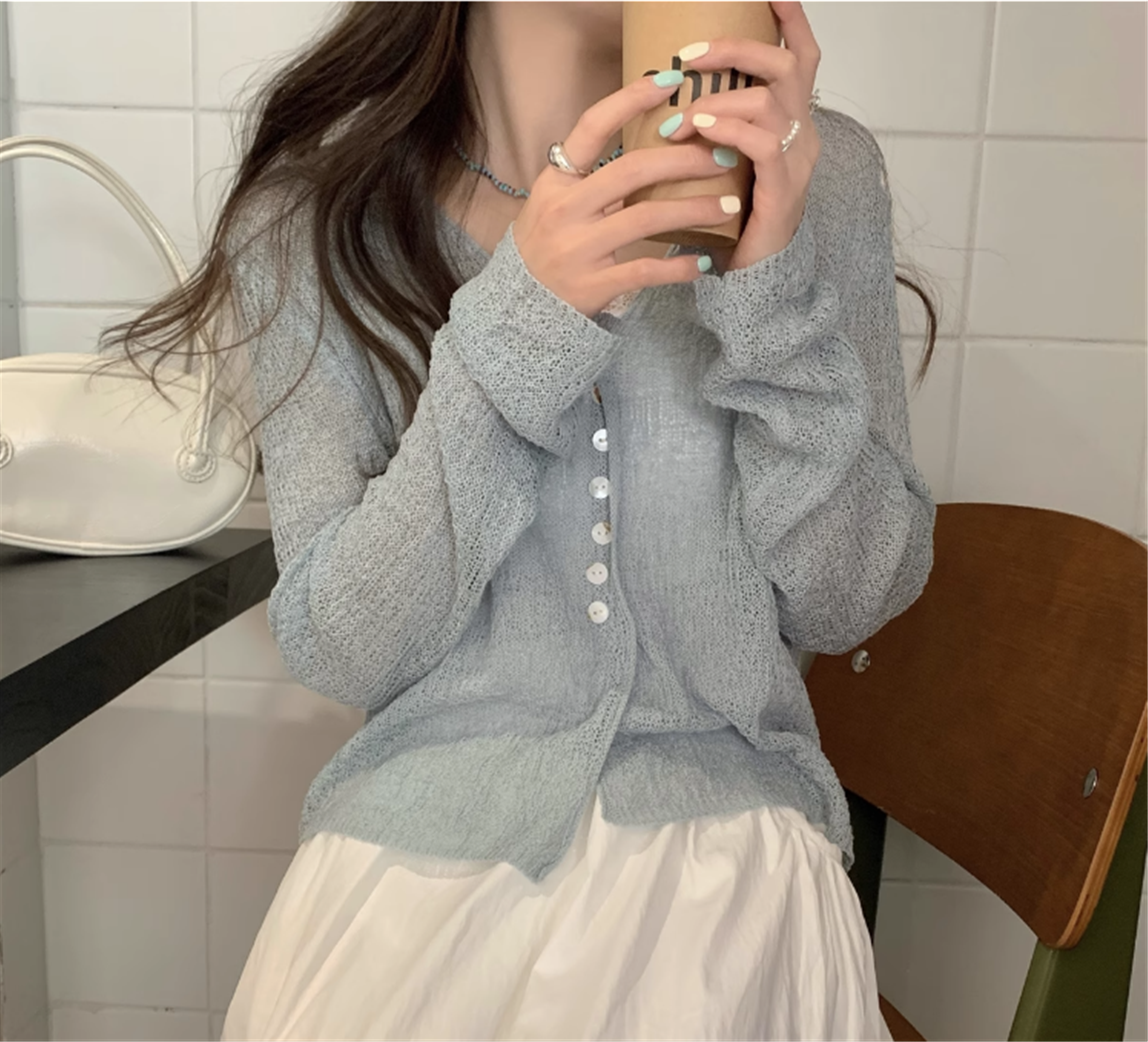 レディース トップス 長袖 カーディガン Vネック 透け感 ボタン かわいい 大人可愛い きれいめ カジュアル おしゃれ 存在感 無地 春 夏 10代 20代 30代 40代 お姉さん お食事 学生 学校 通学 デート お出かけ 旅行 女子会 休日 カフェ お揃い 双子 韓国 オルチャン コーデ 普段使い 着回し モテ 清楚 インスタ映え 定番 フリーサイズ ワンサイズ ブラック ホワイト オフホワイト アプリコット ピンク ブルー 水色