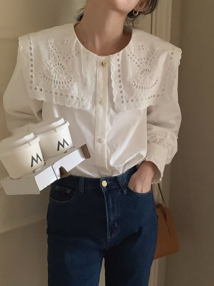 レディース トップス シャツ ブラウス 長袖 ボリューム袖 角襟 フェミニン 刺繡 かわいい 大人可愛い きれいめ シンプル カジュアル 上品 おしゃれ ガーリー ラブリー キュート ロマンティック ナチュラル 無地 オールシーズン 10代 20代 30代 40代 お出かけ ショッピング 体型カバー プチプラ 普段使い 着回し モテ 清楚 トレンド 流行 インスタ映え 定番 全方位映え 着映え S M L XL 白 ホワイト ベーシックカラー 大人カラー 春カラー 秋カラー
