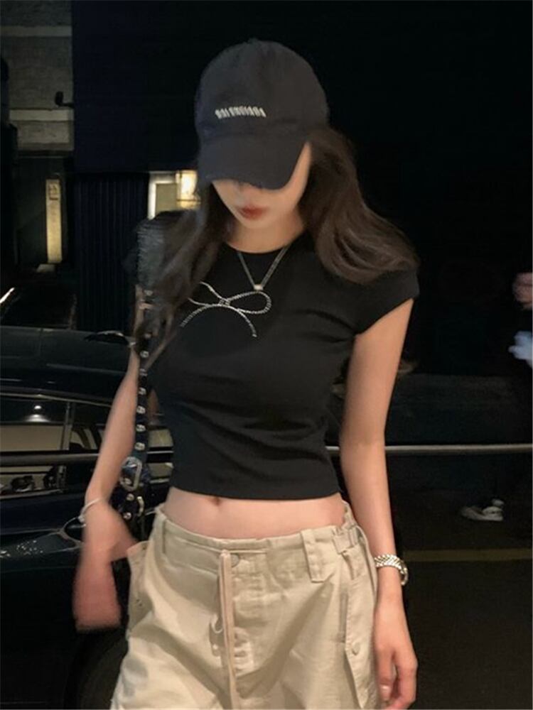 レディース トップス プルオーバー Tシャツ クロップド丈 半袖 ラウンドネック ストリート リボン かわいい 大人可愛い シンプル カジュアル おしゃれ かっこいい ガーリー ラブリー キュート ナチュラル 無地 オールシーズン 10代 20代 30代 40代 お出かけ ショッピング 体型カバー プチプラ 普段使い 着回し モテ 清楚 トレンド 流行 インスタ映え 定番 全方位映え 着映え S M L XL 黒 ブラック ベーシックカラー 大人カラー 春カラー 秋カラー