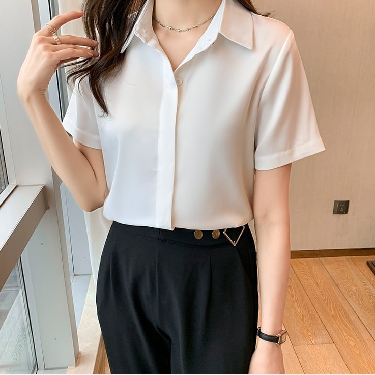 レディース トップス シャツ 前開き Yシャツ 半袖 襟付き ポロカラー スリム 細身 フォーマル スマート シフォン ボタン かわいい 大人可愛い きれいめ シンプル カジュアル 上品 おしゃれ こなれ感 マニッシュ 主役級 都会的 クラシカル ベーシック ナチュラル 無地 春 夏 秋 ママ お姉さん オフィスカジュアル OL 通勤 デート お出かけ 女子会 休日 着回し 清楚 流行 定番 S M L XL 2XL 3XL ホワイト ブラック アプリコット ライトブルー ライトグリーン