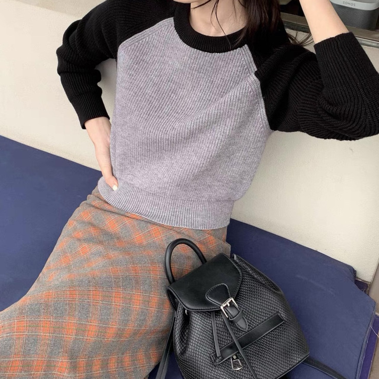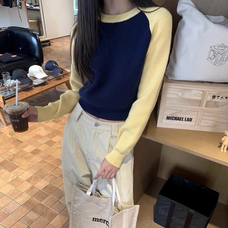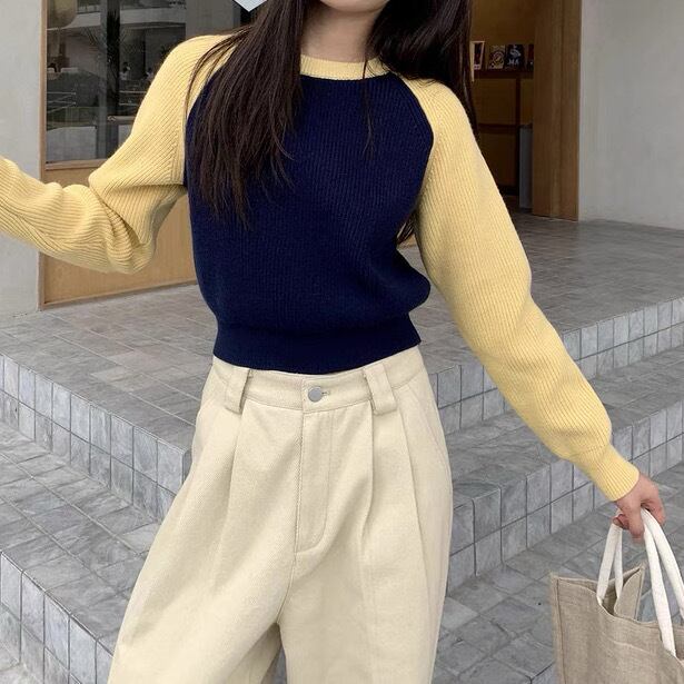 レディース トップス ニット セーター ショート 長袖 ラグラン ラウンドネック ハイウエスト リブニット アメカジ バイカラー 配色 コントラストカラー 大人可愛い シンプル カジュアル おしゃれ かっこいい レトロ こなれ感 個性的 抜け感 クラシカル アメリカン アクティブ 無地 秋 冬 10代 20代 30代 学生 デート お出かけ 公園 女子会 休日 ショッピング 韓国 オルチャン コーデ コーディネート スタイル 普段使い 着回し トレンド 流行 サイズ S M L グレー ピンク ネイビー