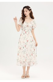 華やかな花柄が印象的なレディースワンピース。Vネックとフリル、そしてリボンやバックのシャーリングが女性らしさを引き立てます。ミモレ丈とAラインで、スタイルアップも叶える嬉しいアイテム。着るだけで一気におしゃれ度がアップし、どんなシーンでも存在感を放つこと間違いなし。