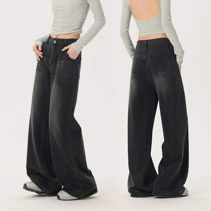 カッコよく、どんなスタイルにも合わせやすいブラックグレーのワイドストレートジーンズ。