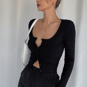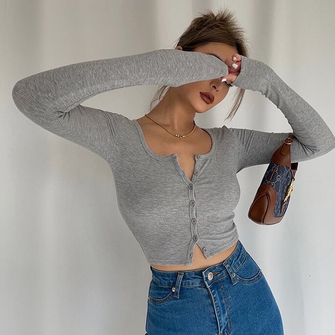 ショート丈なのでハイウエストのボトムスと相性抜群です。襟元はUネックで深く開いたデザインがデコルテラインを綺麗にみせてくれます。程よく身体のラインにフィットし女性らしいシルエットを作り上げてくれます。