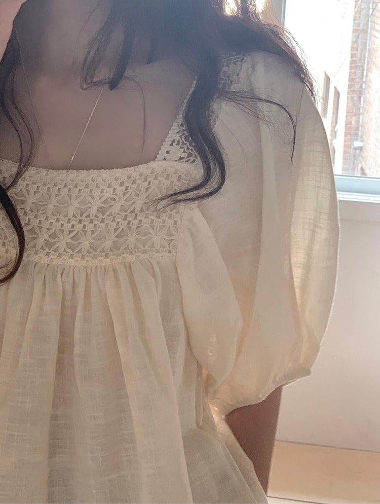 カギ編みレースのデコルテ装飾がドレッシーな魅力のアイテムです。半袖のパフスリーブとバックオープンのスクエアネックが女性らしい印象を演出し、カギ編みとレースのディテールが上品さをプラスしています。ワイドなフレアシルエットが、体型をカバーしながらもおしゃれに見せてくれます。春夏のシーズンやフォーマルな場面にも適したトップスは、さまざまなシーンで活躍してくれること間違いなしです。