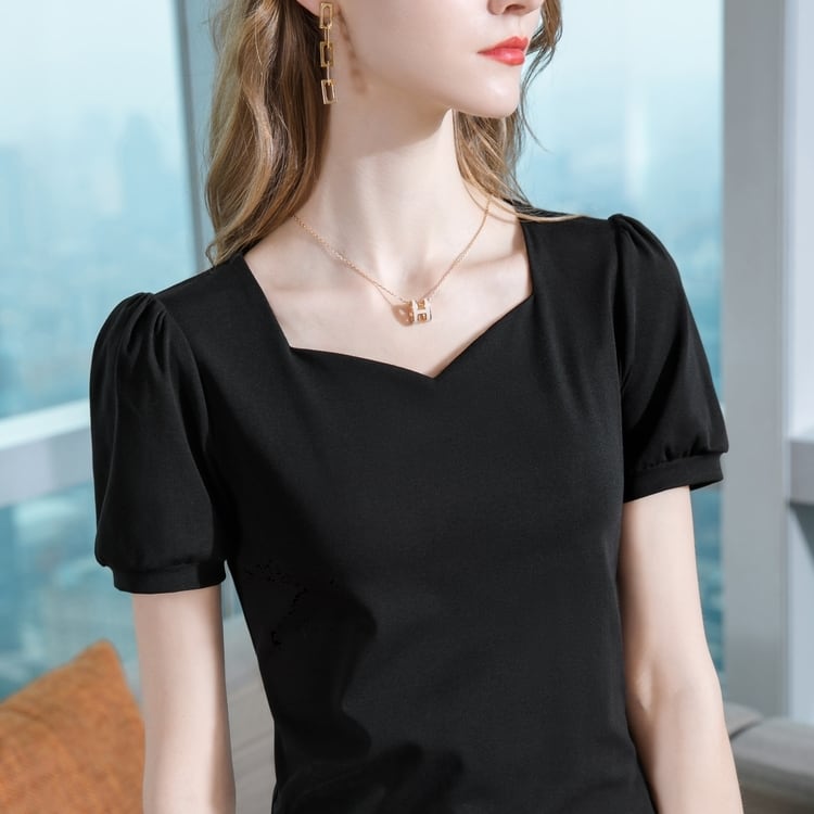 洗練されたデザインが人気のペンタゴンネックのパフスリーブカットソー。カジュアルからオフィスまで、幅広いシーンで活躍する一枚です。上品な印象を与えるスリムなシルエットと、可愛らしいパフスリーブが相まって、大人可愛いスタイリングを叶えます。春夏の爽やかなコーディネートにぴったりなアイテムです。