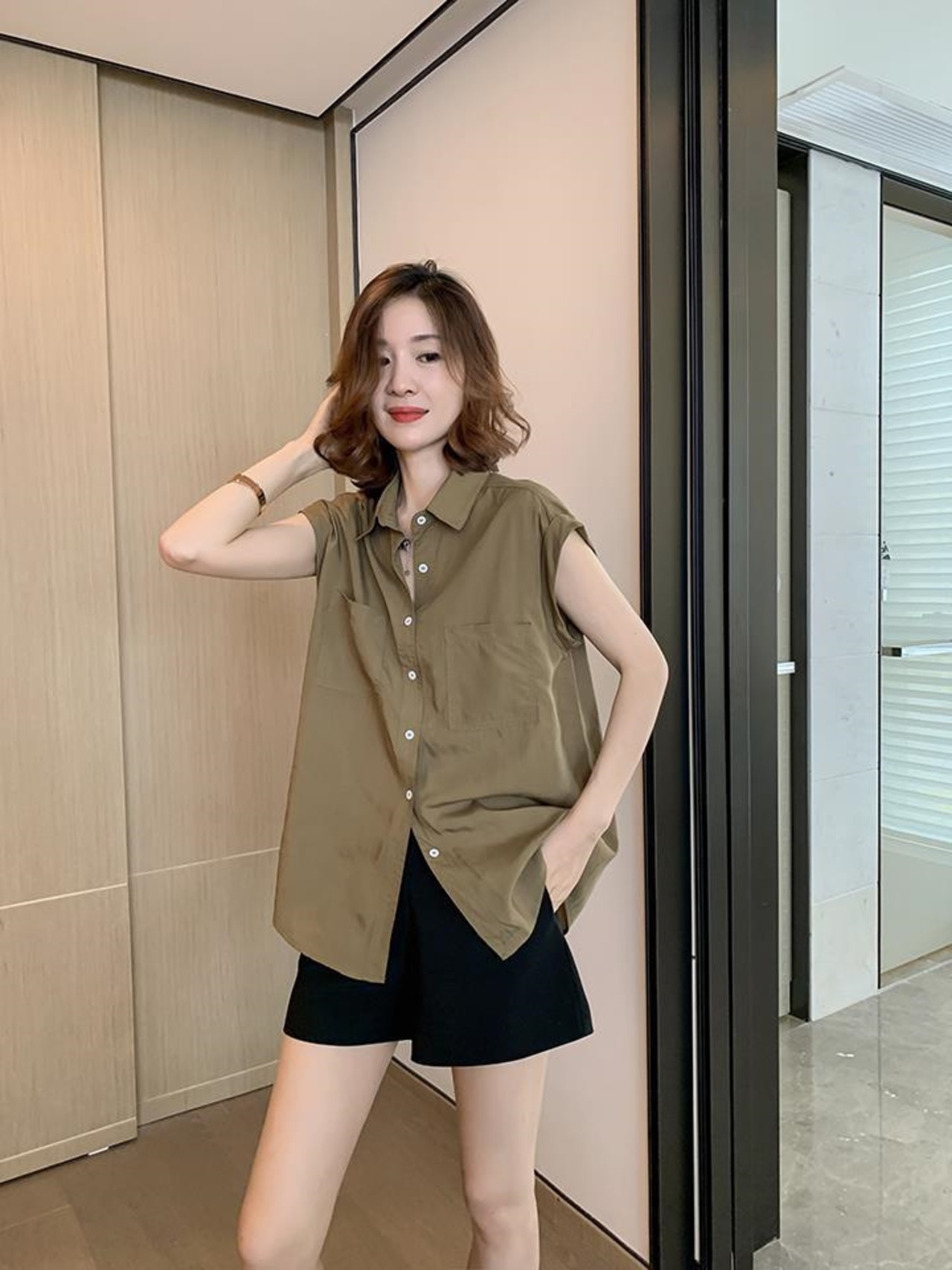 シンプルで上品なデザインが特徴の短め袖のフレンチスリーブシャツ。前開きのデザインに大きめポケットがついており、大人可愛い雰囲気を演出しています。ベーシックなカラー展開なので、様々なスタイリングに合わせやすく、オフィスからカジュアルまで幅広く着用可能です。