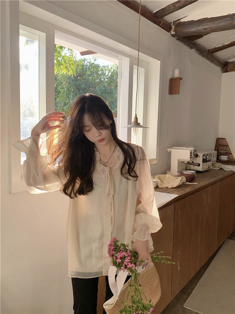 ふんわりとしたシルエットが大人可愛いシースルーフリルブラウス。