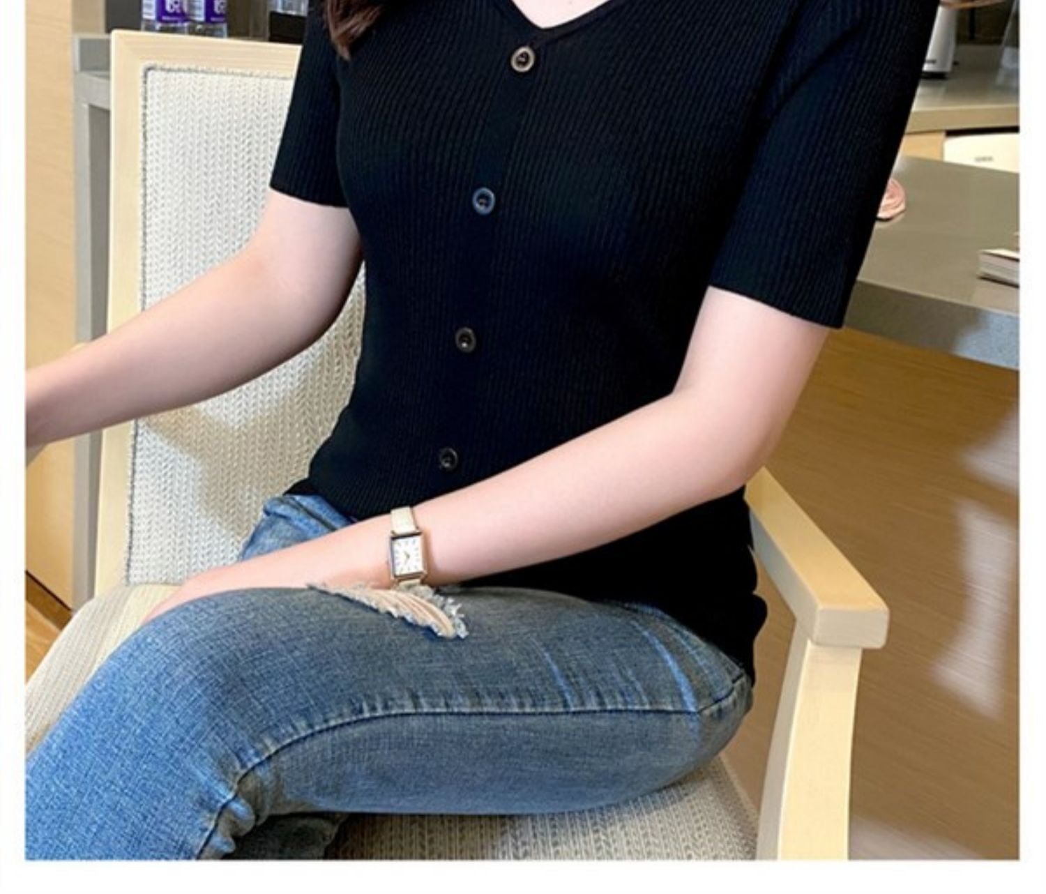 ラフなカジュアルスタイルからきれいめまで幅広く対応する、レディースニットセーターが登場。半袖なので、春夏の季節にピッタリのアイテムです。前開き風のボタン付きデザインのVネックが首元をスッキリ見せ、タイトでスリムなシルエットが女性らしいスタイルを演出します。洗練された雰囲気を手軽に楽しめる、かわいさと上品さを兼ね備えたデザインです。