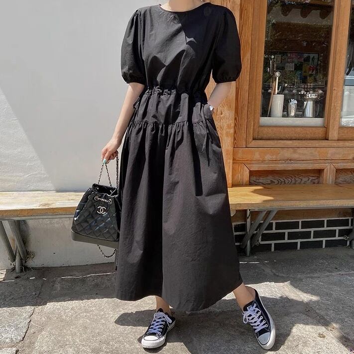 甘め 休日スタイル 夏コーデ レディース ワンピース フレア マキシ 5分袖 ボリューム袖 パフスリーブ ラウンドネック Aライン フェミニン タック ウエストマーク ウエストリボン かわいい 大人可愛い きれいめ シンプル おしゃれ ガーリー 抜け感 ラブリー キュート ロマンティック 無地 春 夏 デート お出かけ イベント リゾート 休日 バカンス ショッピング ライブ フェス 楽ちん 体型カバー 普段使い 着回し レイヤード トレンド 流行 インスタ映え 着映え S M L XL 黒 ブラック