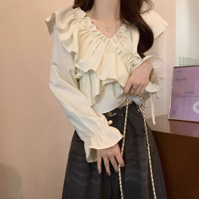 レディース トップス シャツ ブラウス ショート 長袖 ベルスリーブ Vネック スリム フェミニン リボン かわいい 大人可愛い きれいめ 上品 おしゃれ レトロ ガーリー ラブリー キュート ロマンティック 無地 春 夏 秋 ロングシーズン 10代 20代 30代 40代 お姉さん 推し活コーデ OL 学生 デート お出かけ 休日 ショッピング 体型カバー プチプラ 普段使い 着回し モテ インスタ映え 着映え S M L 白 ホワイト ピンク 水色 ブルー パステル アプリコット 大人カラー 秋カラー