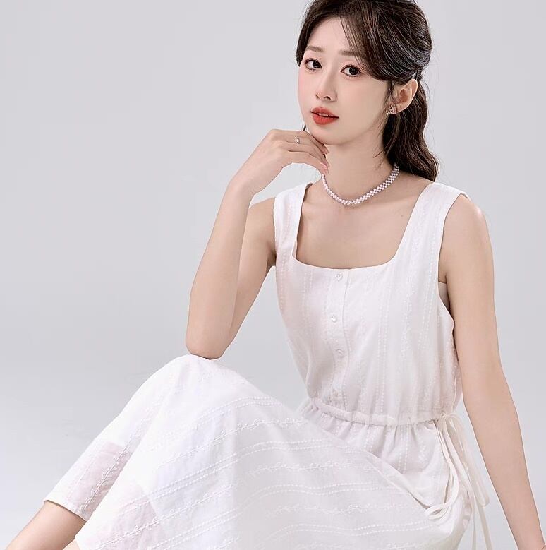 ノースリーブとスクエアネックで涼しげに、ウエストリボンとフレアのAラインが女性らしさを引き立てます。