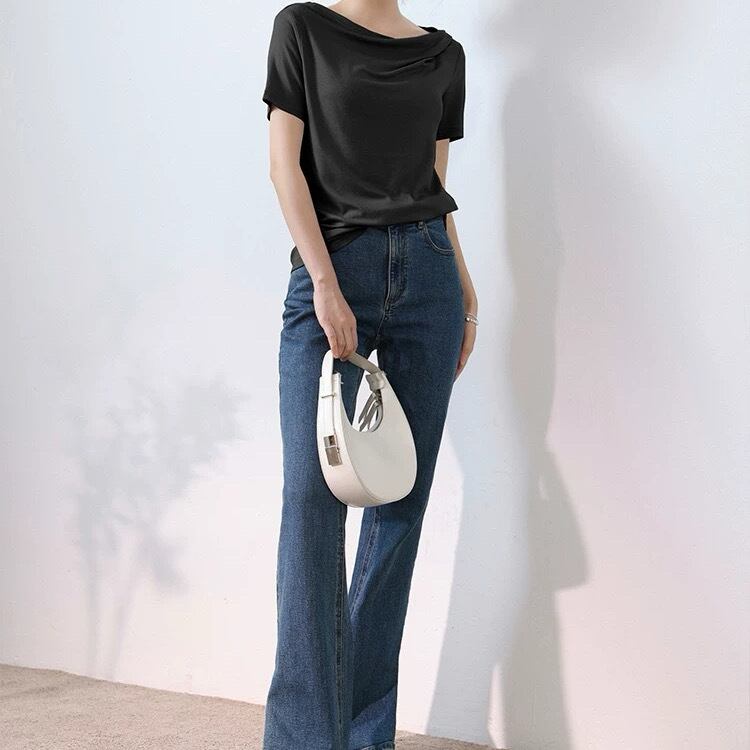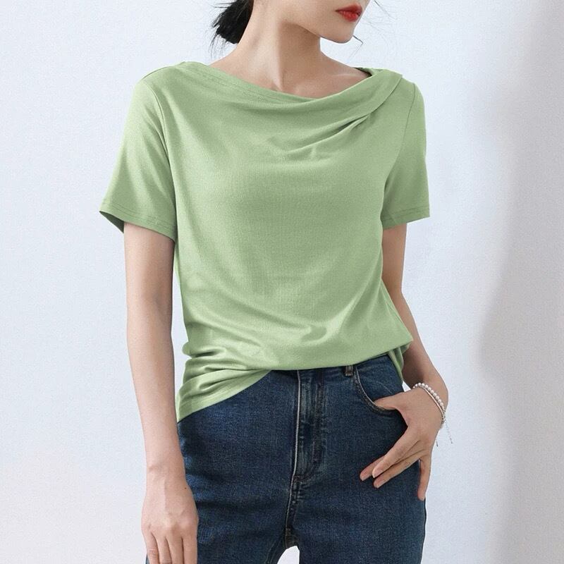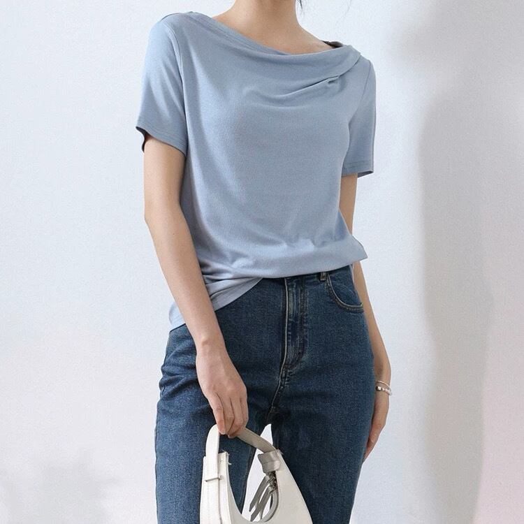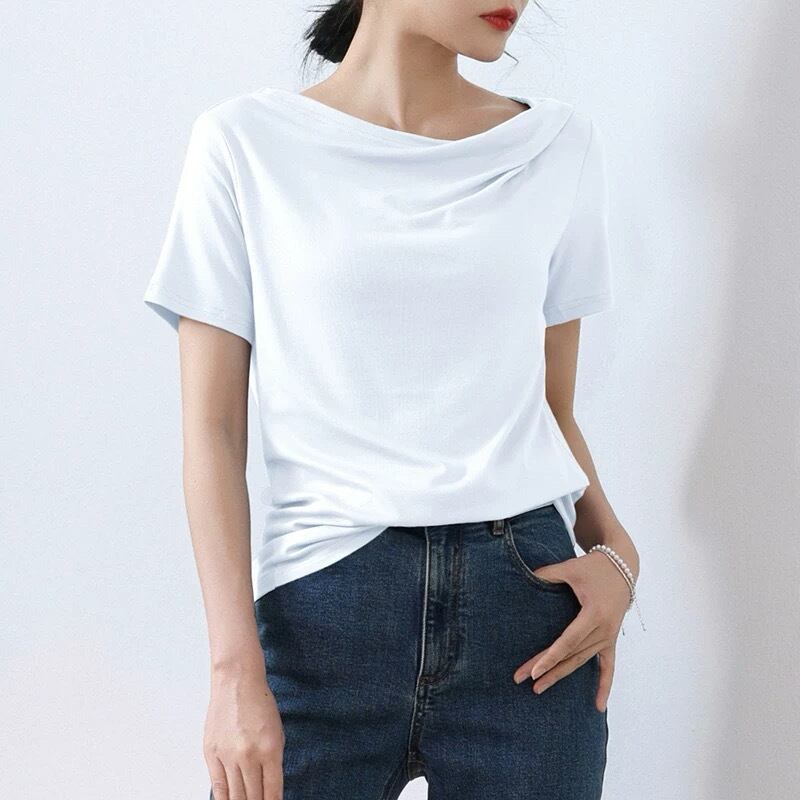 アシンメトリーなドレープが特徴のスイングカラーTシャツ。