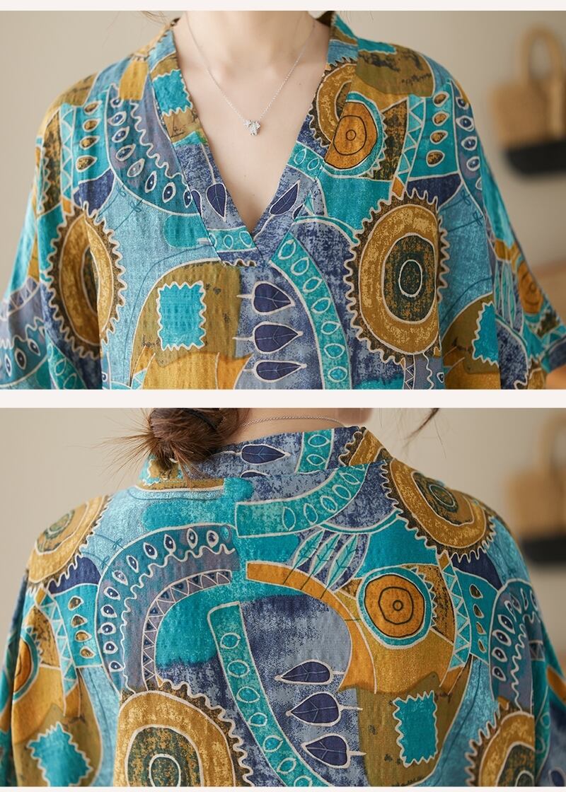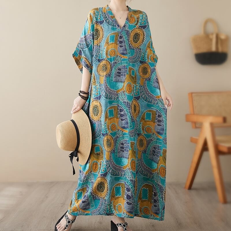 レディース ワンピース シャツワンピ フレア ロング 5分袖 Vネック ボヘミアン バンドカラー Aライン ドロップショルダー 幾何学模様 ワイド フレア かわいい ラフ 大人可愛い きれいめ シンプル カジュアル 上品 おしゃれ かっこいい レトロ アジアン エスニック エキゾチック こなれ感 ガーリー エレガント 存在感 キュート 総柄 春 夏 10代 20代 30代 40代 お姉さん お呼ばれ お食事 パーティー イベント リゾート 楽ちん 体型カバー フリーサイズ ワンサイズ ブルー レッド
