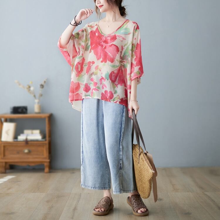 フェミニンで可愛らしい7分袖のVネックデザインの花柄シャツブラウスです。イレギュラーヘムとアシンメトリーな裾の質感がおしゃれなポイントです。ワイドなフレアシルエットが女性らしさを引き立て、大人かわいいスタイルを演出します。