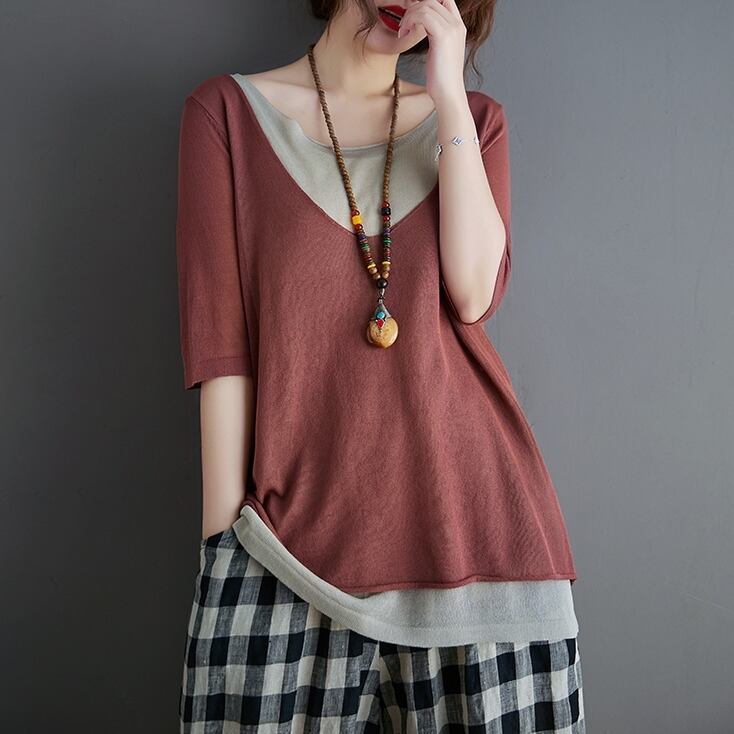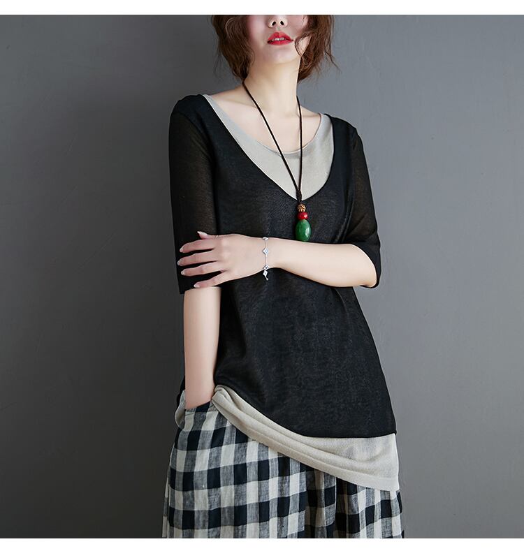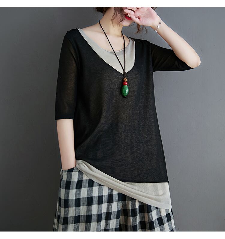 レディース トップス カットソー 5分袖 ラウンドネック フェイクレイヤード バイカラー 透け感 大人可愛い きれいめ シンプル カジュアル 上品 おしゃれ かっこいい レトロ こなれ感 ラフ ガーリー ルーズ エレガント 存在感 抜け感 キュート ラグジュアリー 春 夏 10代 20代 30代 40代 お姉さん お呼ばれ お食事 OL 通勤 学生 お出かけ パーティー イベント レストラン 公園 コンサート ライブ フェス 楽ちん 体型カバー 着回し フリーサイズ ブラック グレー ブルー レッド