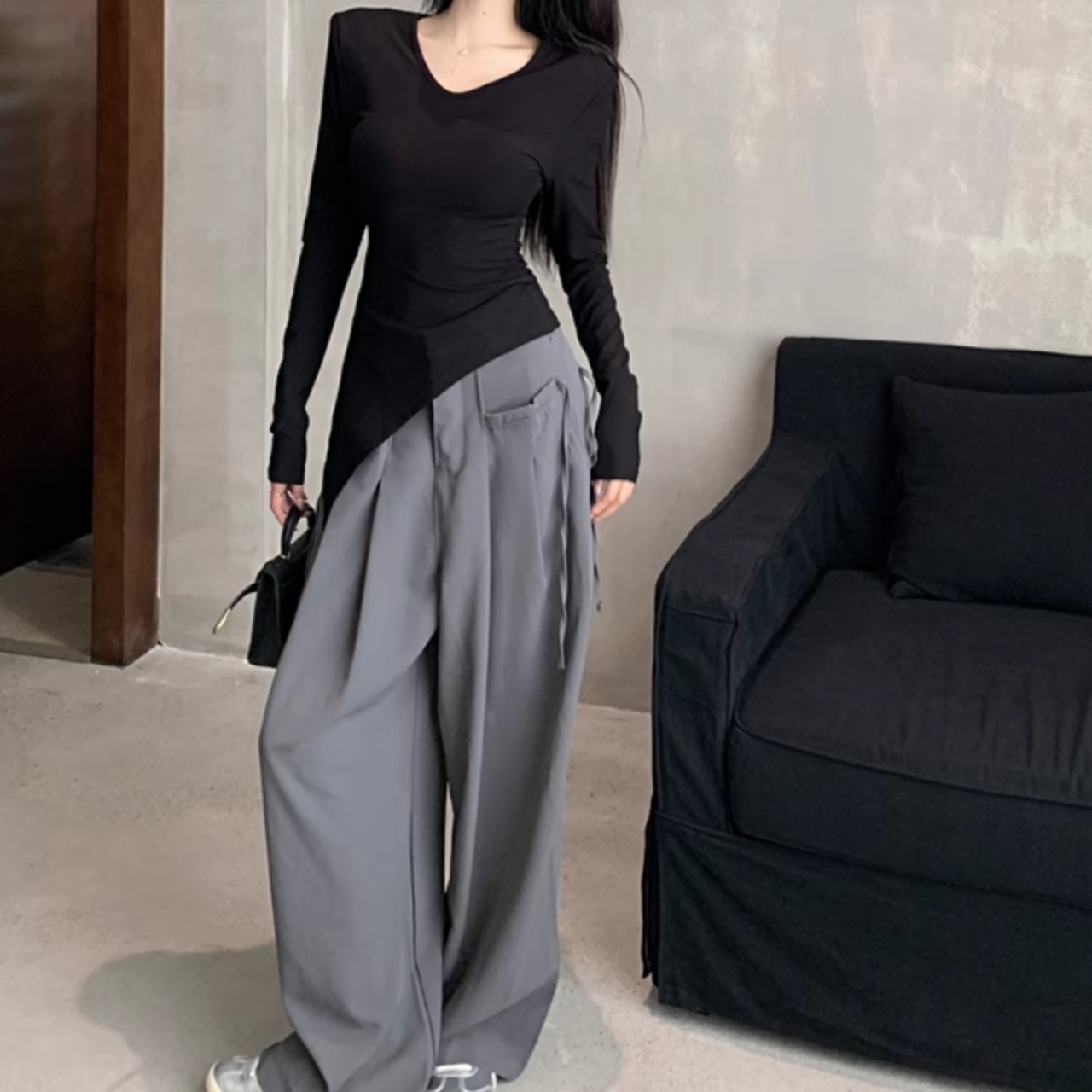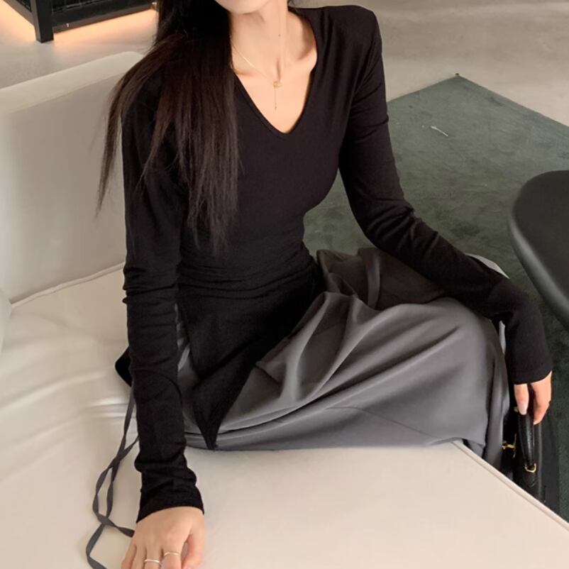 レディース トップス ロンT プルオーバー 長袖 Vネック スリム 細身 アシンメトリー スマート 伸縮性 薄手 かわいい 大人可愛い きれいめ シンプル カジュアル 上品 おしゃれ かっこいい レトロ こなれ感 ラフ ルーズ 個性的 クール エレガント モダン 主役級 存在感 抜け感 ラブリー キュート 都会的 アクティブ ナチュラル セクシー 無地 デート お出かけ リゾート 公園 女子会 休日 ショッピング カフェ コーデ 普段使い モテ トレンド インスタ映え S M L XL 2XL ブラック